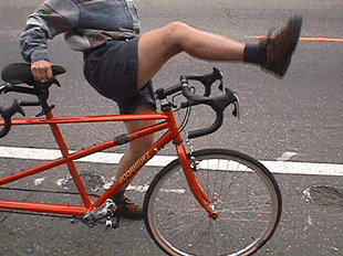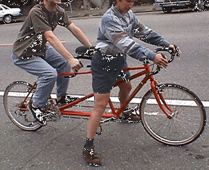 Now you have both riders on the bike and the pedals turning. The captain can wait a few revolutions before getting into toeclips or clipless pedals if it takes some concentration or coasting. It is best to get thru an intersection or get up some speed and then coast for a second while you adjust anything you need to.